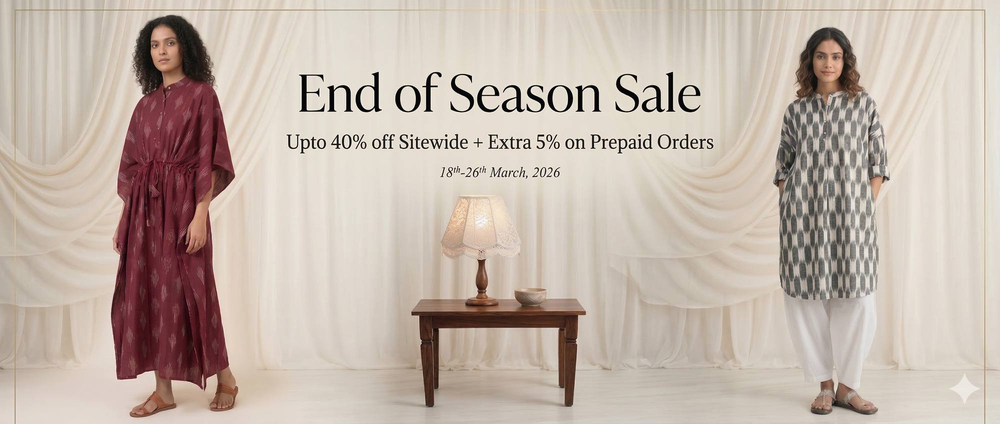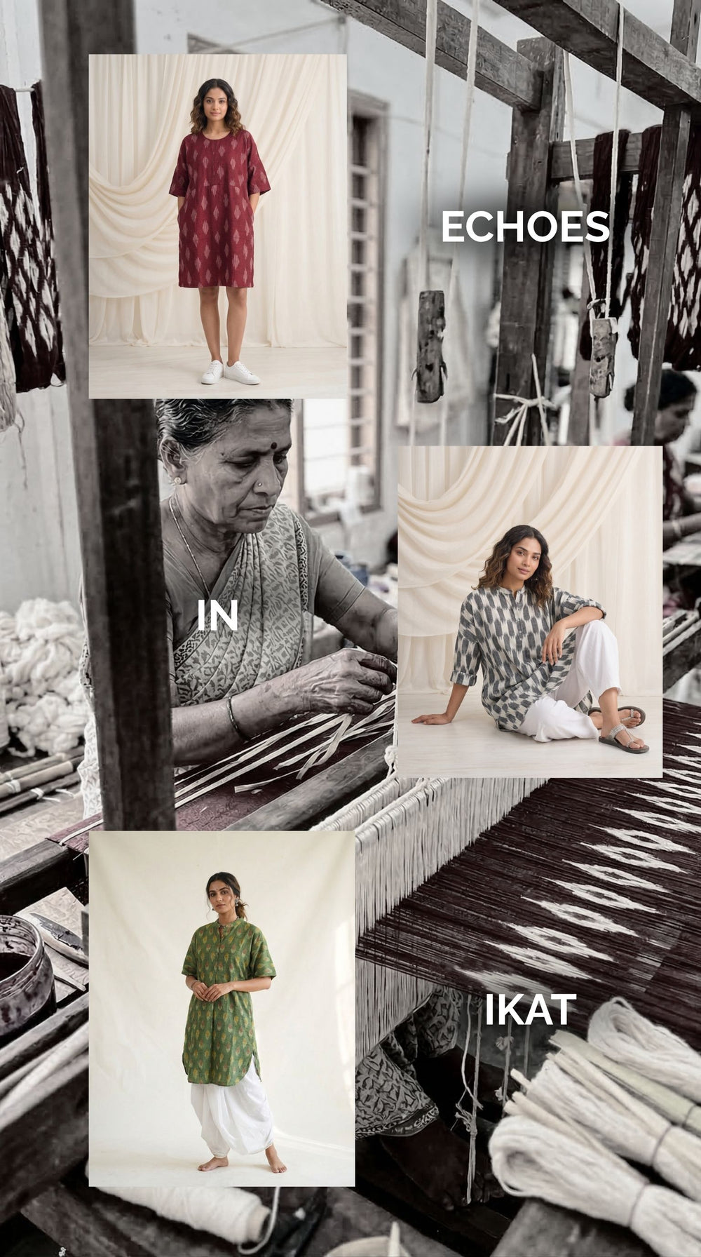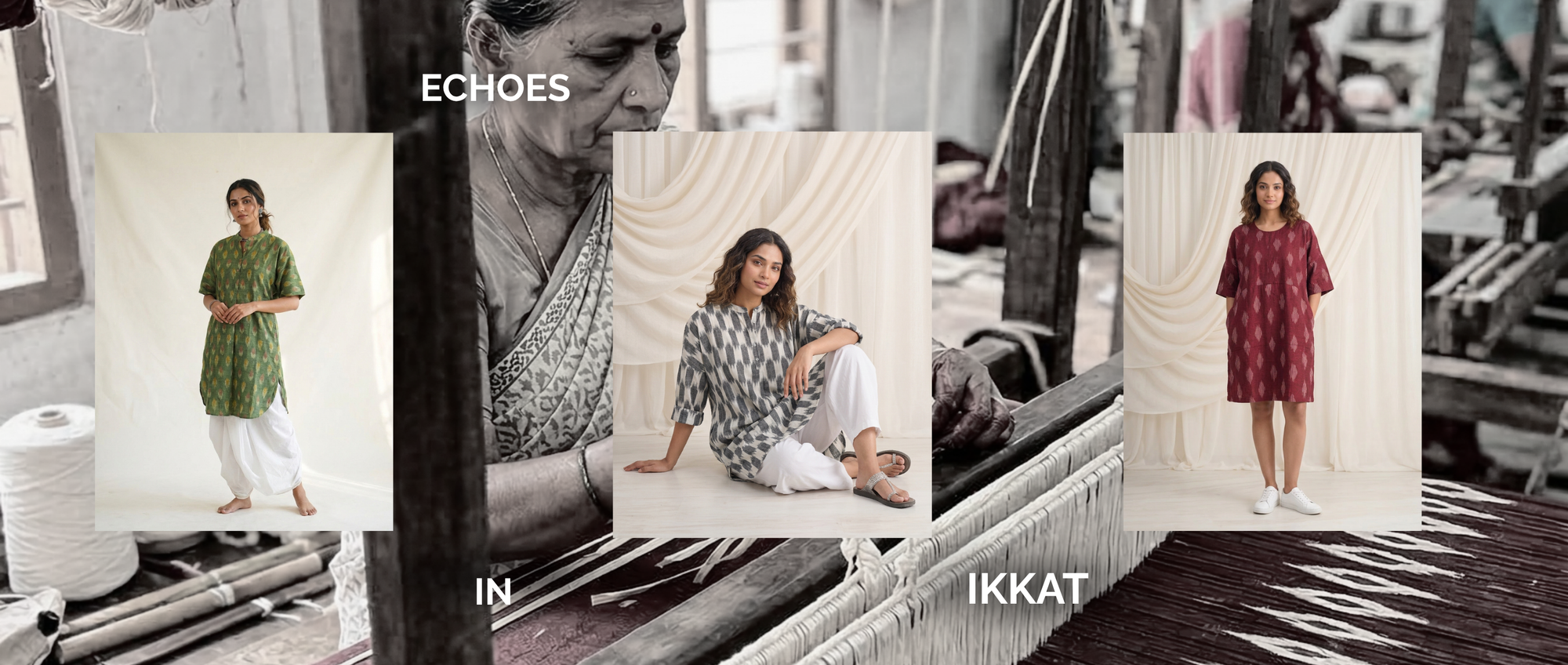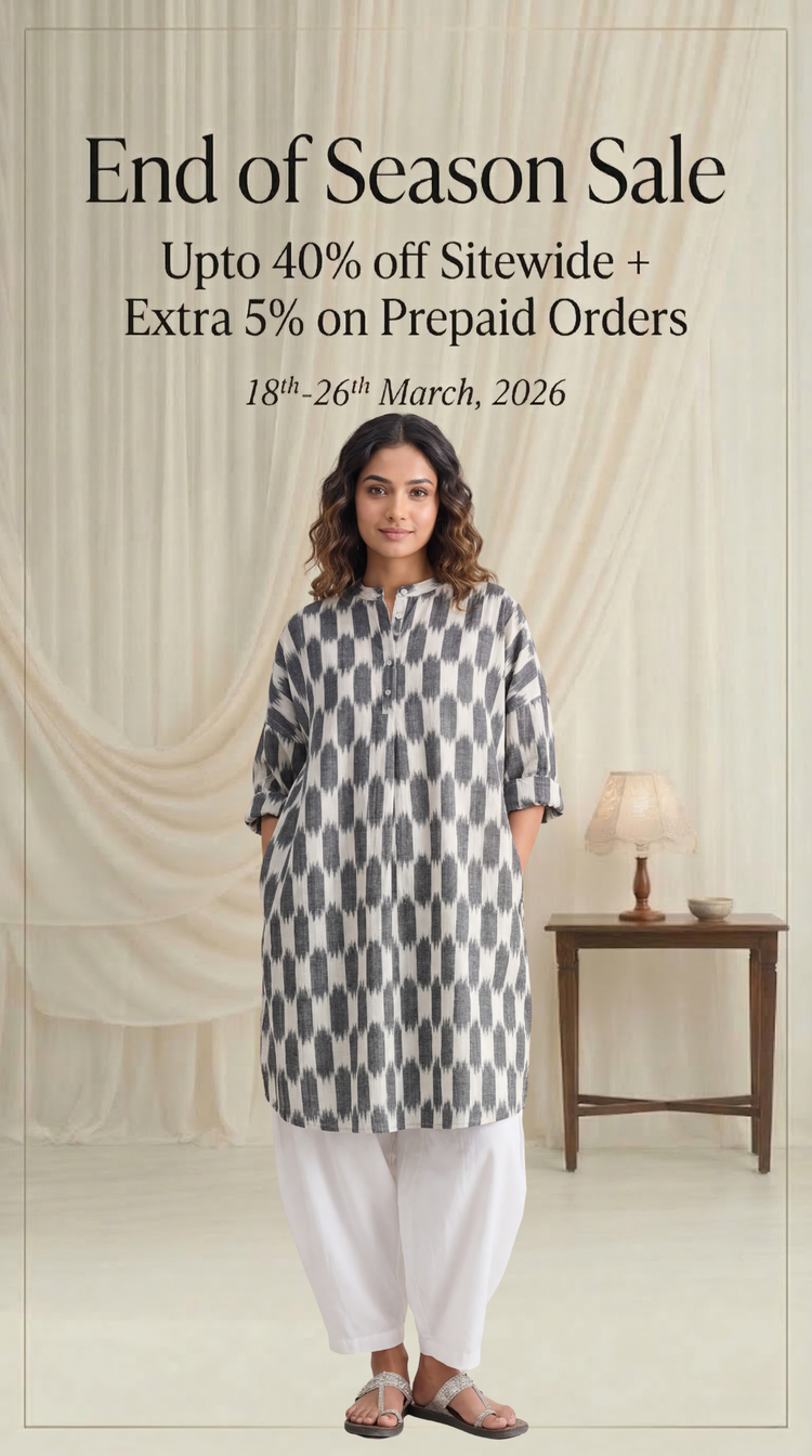 Echoes in Ikat celebrates one of India’s most intricate weaving traditions. Crafted in single Ikat, each piece begins with carefully tied and dyed cotton yarns that reveal their patterns only when woven together — a process that demands exceptional skill and precision.