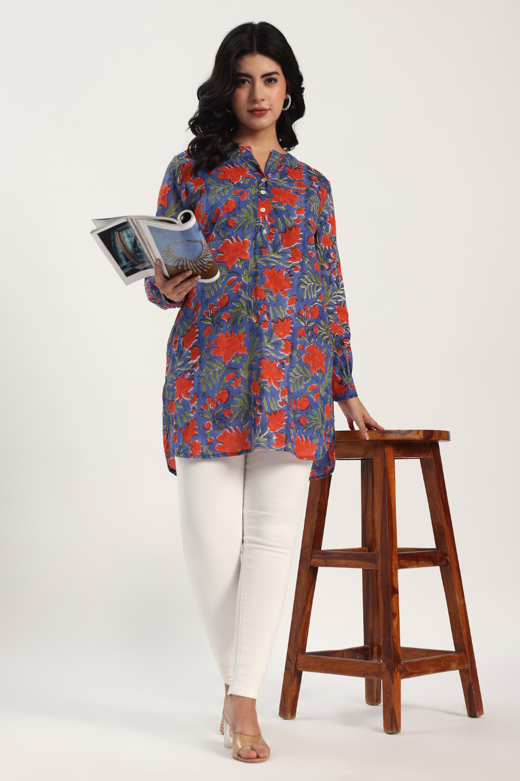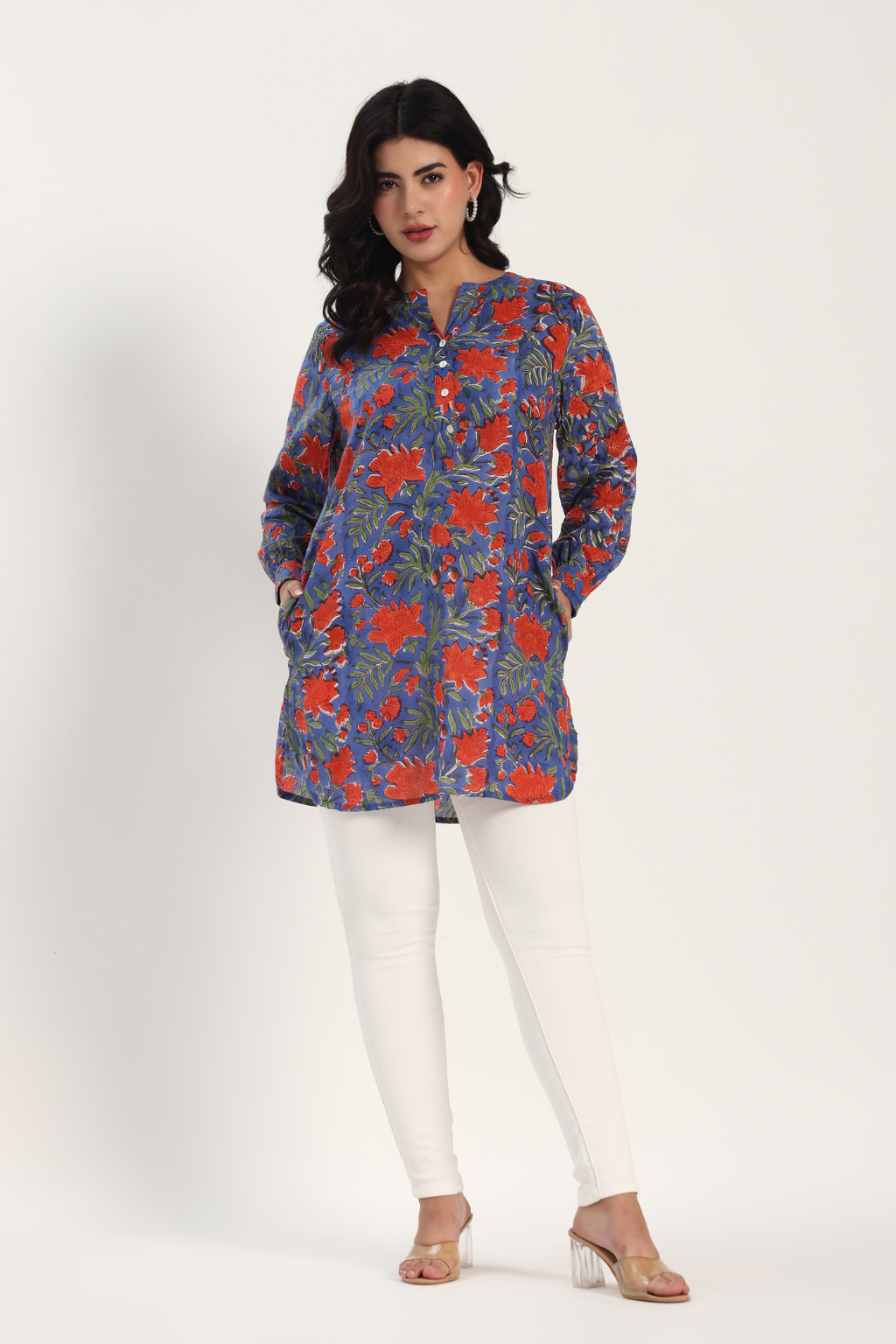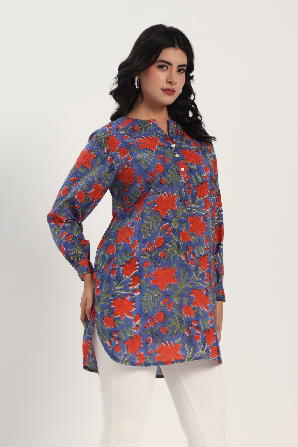 Add a touch of easy elegance to your everyday look with our Hand Block Printed Cotton Kurti. Made from soft, breathable cotton, comfy, and perfect for all-day wear. The hand block printed floral design in vibrant red on a calm blue base brings a fresh, cheerful vibe to your outfit. Designed with full sleeves, a relaxed fit, and two handy pockets, it’s the perfect mix of beauty and practicality.