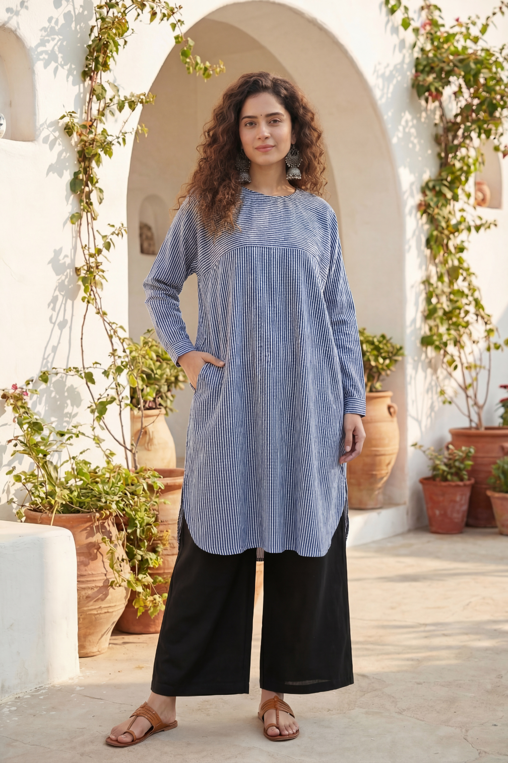 Keep it chic and soulful with this Hand Printed Indigo Stripe Long Kurta — a true celebration of craftsmanship and comfort. Made from 100% pure cotton, this kurta is soft on your skin and breathable enough to keep you comfortable all day long.