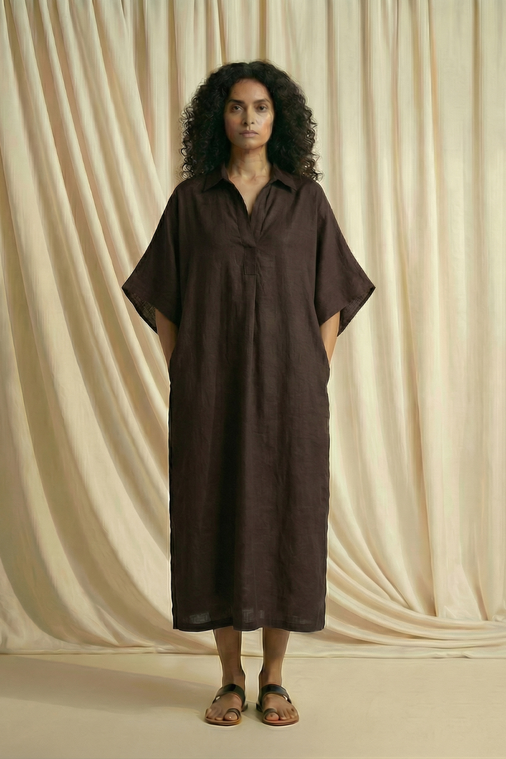 Crafted from airy, breathable linen, this kaftan dress is designed for effortless comfort with an understated, refined appeal. The relaxed anti-fit silhouette falls fluidly on the body, making it ideal for all-day wear and adaptable across life stages, including maternity. Featuring a clean collar neckline, easy short sleeves, and a straight, flowy drape, it celebrates ease without compromising on elegance. Thoughtfully designed with two functional pockets for everyday practicality, this timeless piece is perfect for slow mornings, casual outings, work-from-anywhere days, or unhurried weekends.
