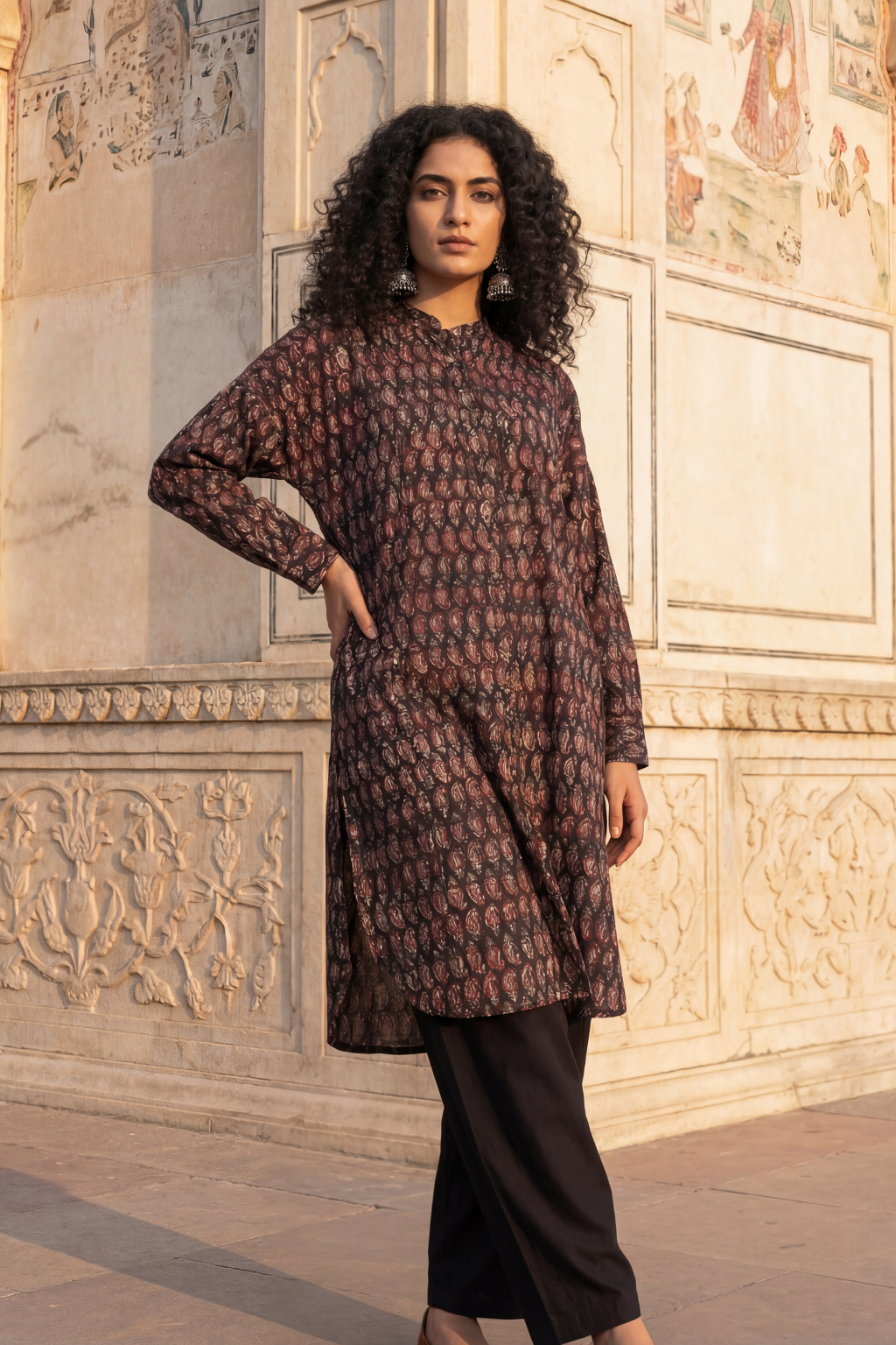 Rooted in the timeless craft of Bagru, the Mehrangini Cotton Kurta is a celebration of earthy elegance and quiet strength. Hand block printed using traditional techniques and natural dyes, its rich, muted tones reflect the beauty of Rajasthan’s soil and heritage architecture. Crafted in breathable, soft cotton with a relaxed silhouette and functional pockets, it is designed for effortless grace — whether you’re at work, at home, or wandering through sunlit courtyards.
