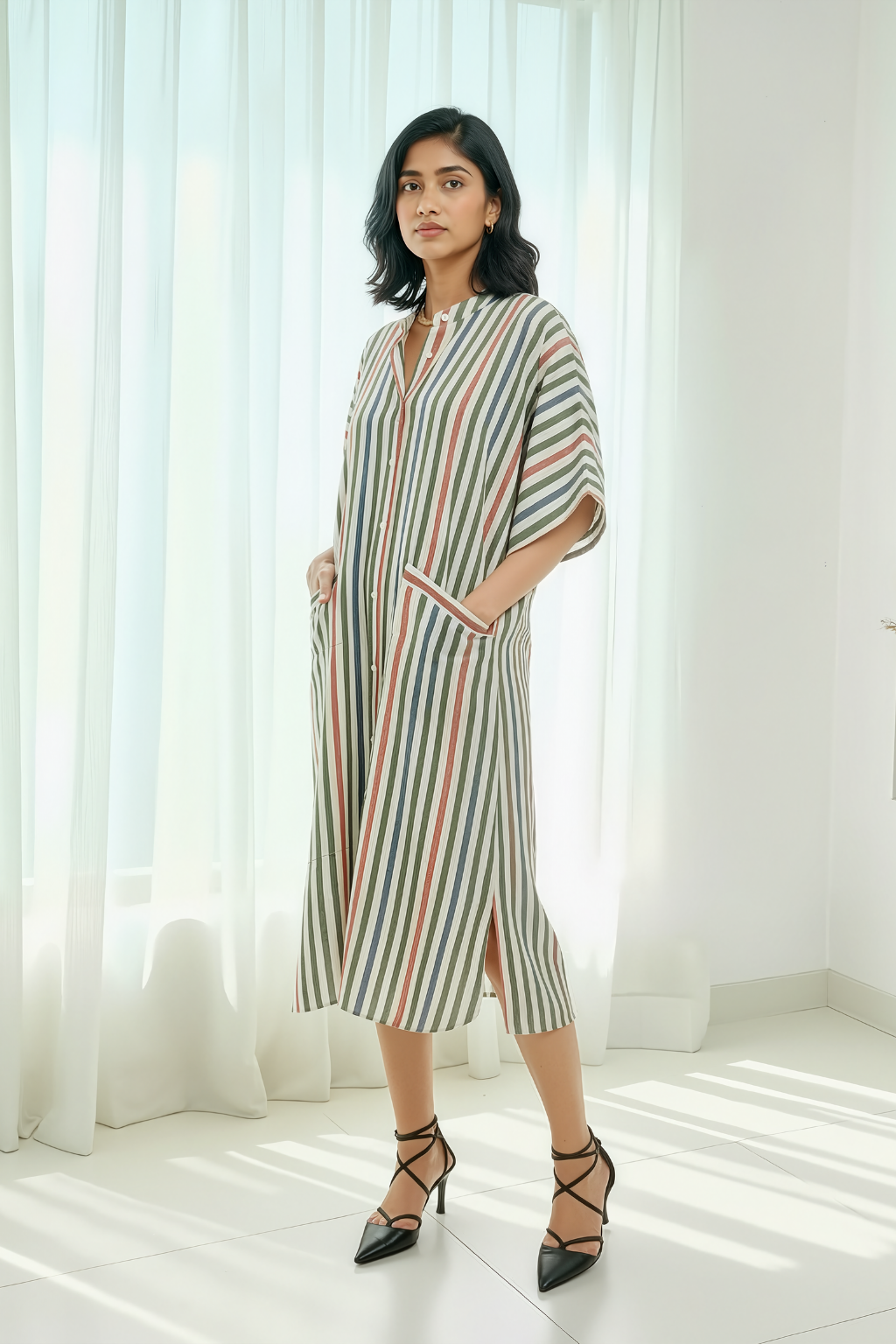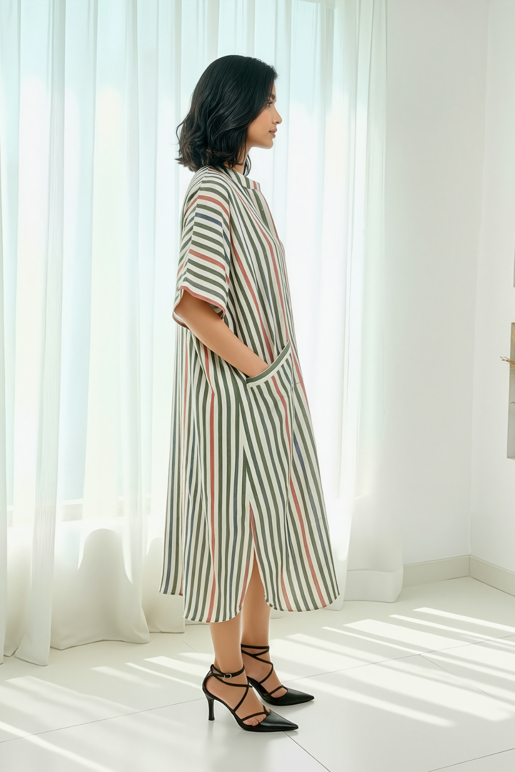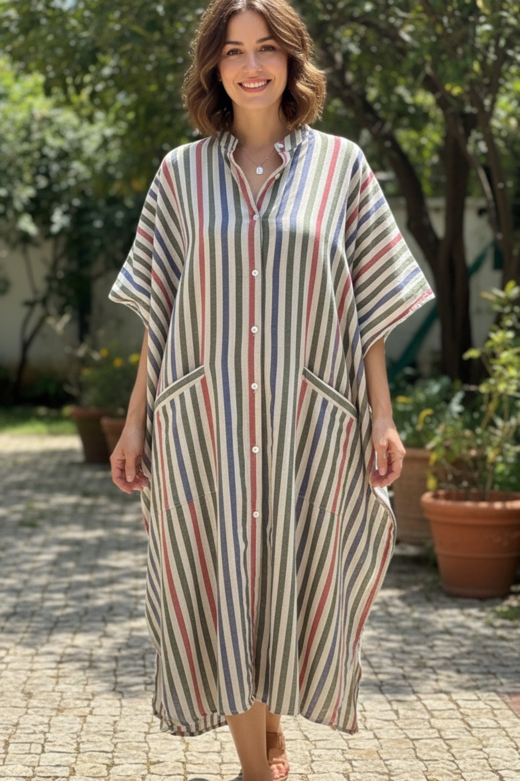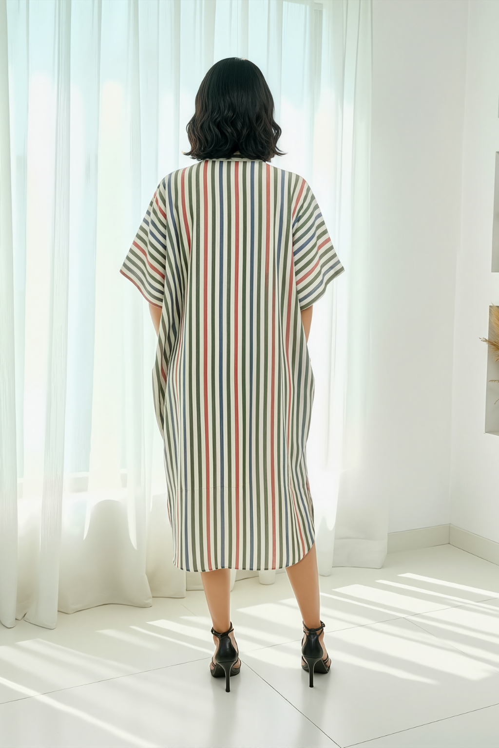 Bring a touch of fun to your wardrobe with our Multicoloured Stripe Cotton Kaftan Shirt Dress. This playful Cotton kaftan shirt dress boasts a relaxed anti-fit, cozy cotton fabric, and a flattering midi length. Equipped with pockets, it combines both comfort and practicality. A top pick for a pure cotton kaftan dress look or as a stylish addition to your kaftan collection, offering effortless everyday charm.