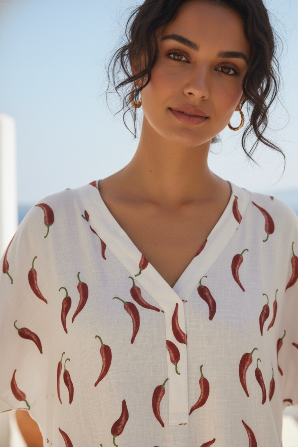 Turn up the heat with our Chili Charm Linen Dress — a playful blend of comfort and spice! Crafted in breathable linen, this easy-breezy silhouette keeps you cool while the bold chili print adds a dash of fun to your look. Perfect for sunny getaways, beach strolls, or brunch by the sea — effortless style has never looked this refreshing!